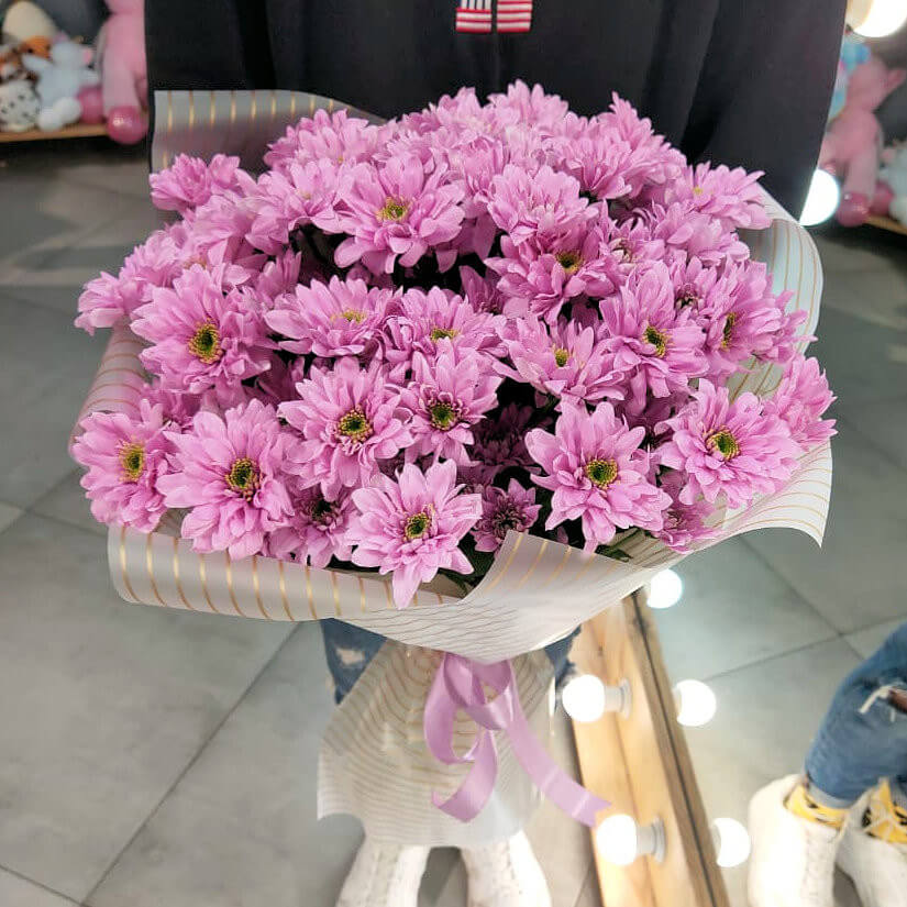 Чудесный стойкий моно букет из 9 кустовых хризантем в стильном оформлении. Если Вы хотите подарить незабываемые эмоции дорогому человеку — закажите доставку цветов в Zakazbuketovkz