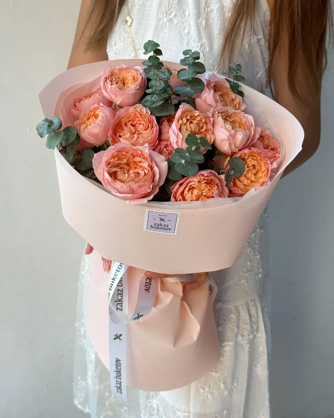 Пиони Роуз Мини – очаровательный букет из пионовидных роз тёплого персикового оттенка. Нежные лепестки и свежая зелень эвкалипта делают композицию лёгкой, утончённой и очень трогательной.