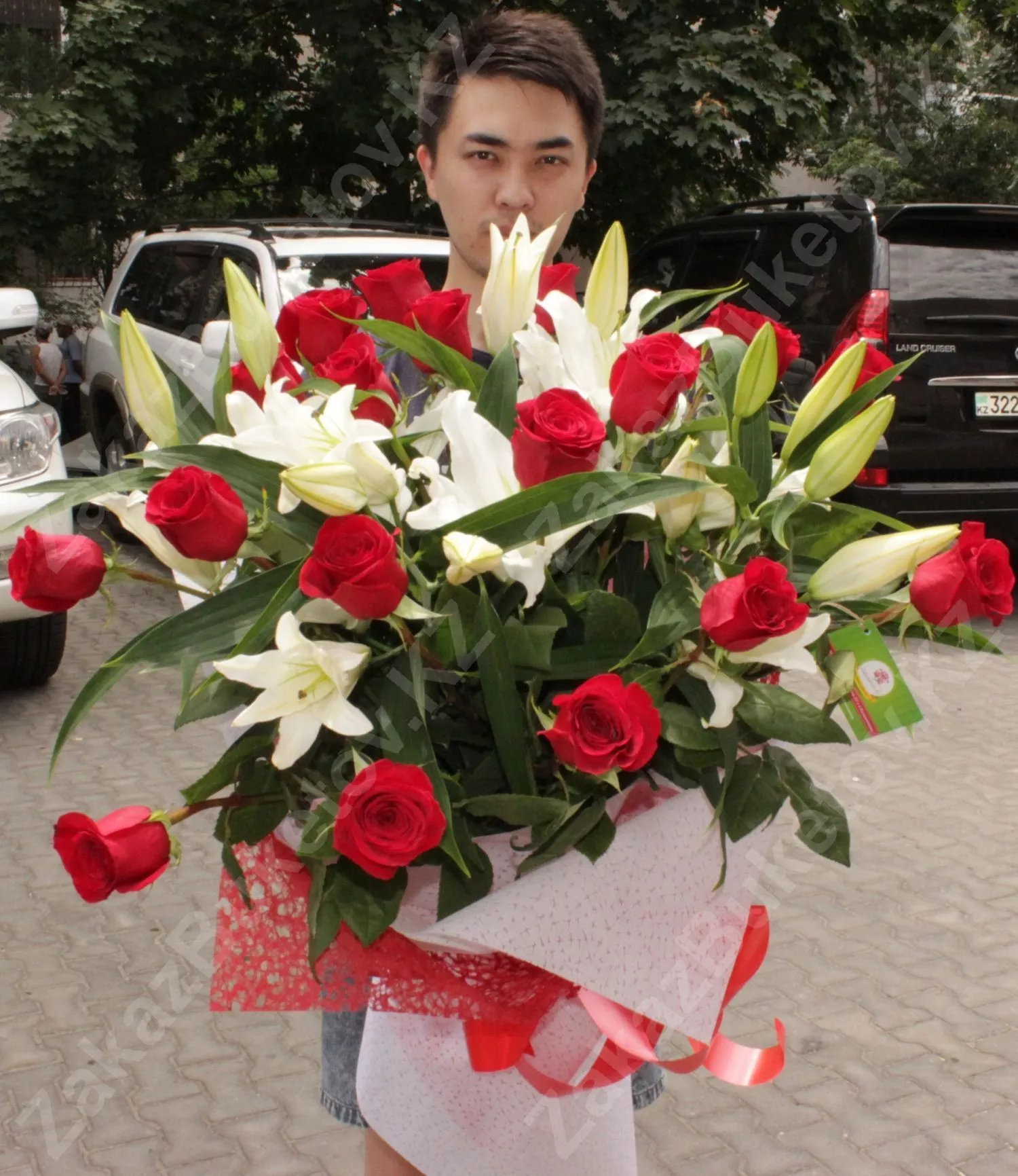 Роза голландская 60 см - 17; Лилия азиатка (Голландия) - 3; Рогожка - 4; Открытка - 1; Шпажка для открытки - 1;