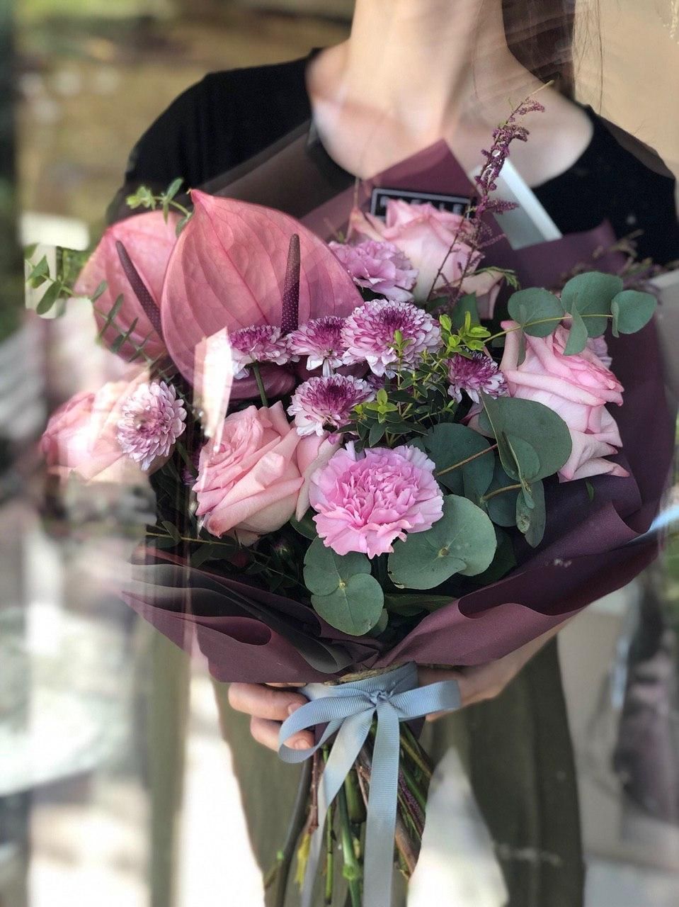 Пионовидная роза (Англия) - 4; Хризантема кустовая (Голландия) - 2; Антуриум (Голландия) - 2; Гвоздика (Голландия) - 3; Зелень местная (средний букет) - 0.5; Эвкалипт (Голландия) - 2; Калька в ассортименте - 4; Открытка - 1;