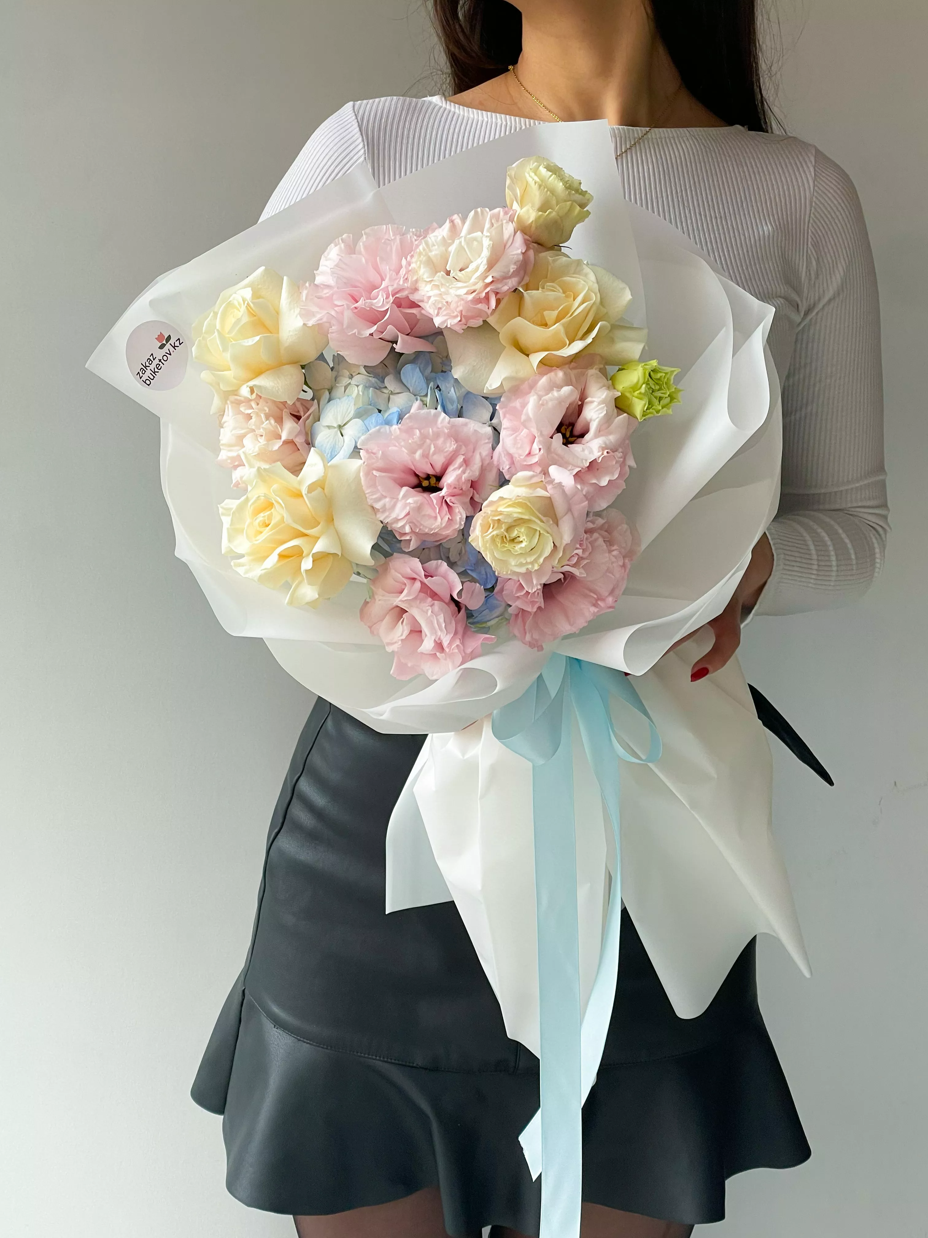 Гортензия (Колумбия) - 1; Калька в ассортименте - 4; Лизиантус (Израиль) - 4; Роза голландская 60 см - 3; Открытка - 1; Шпажка для открытки - 1;