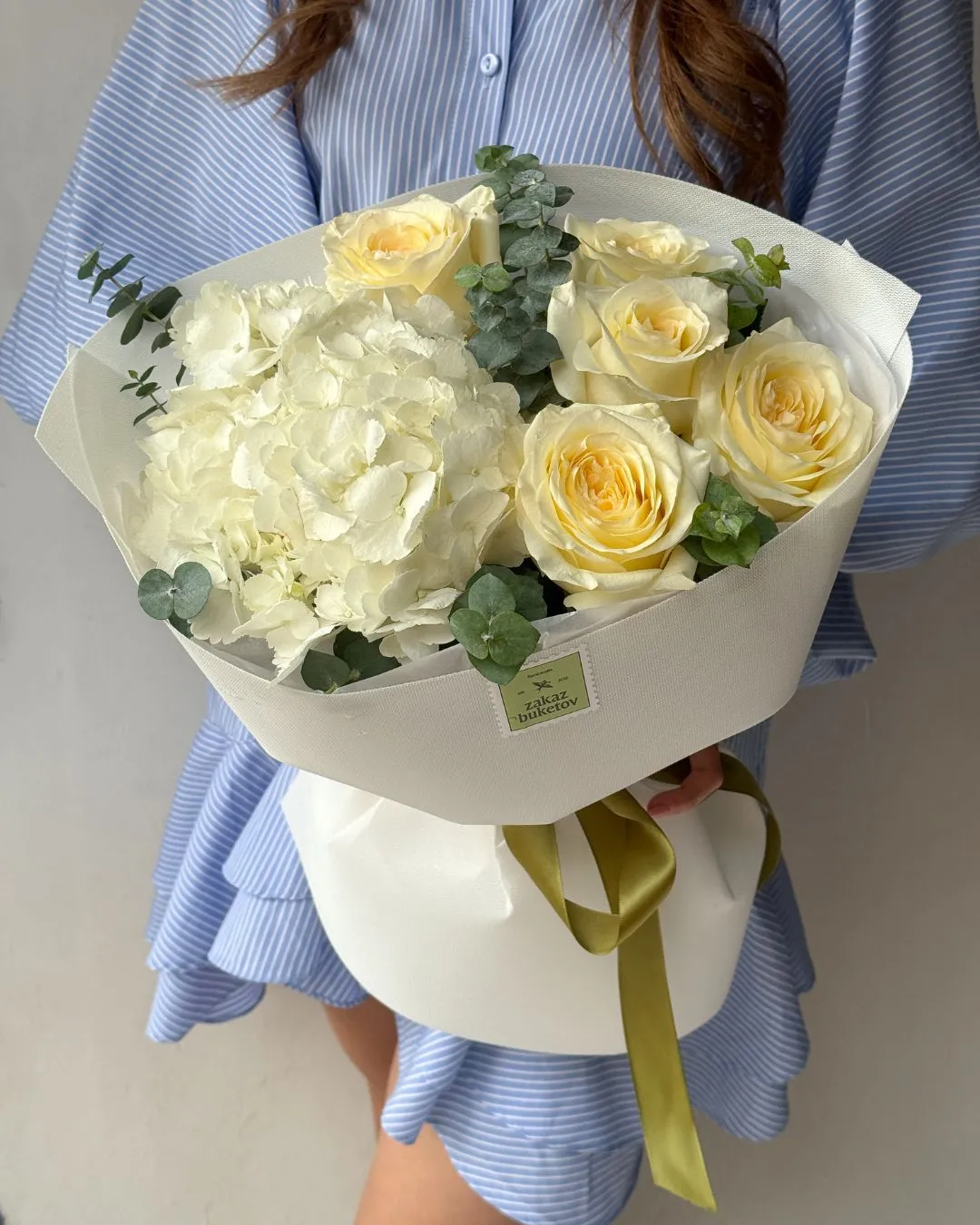 Обрадуйте любимых без повода! Подарите букет, в котором идеально сочетаются две самые популярные цветы в мире - сортовые розы и гортензии.