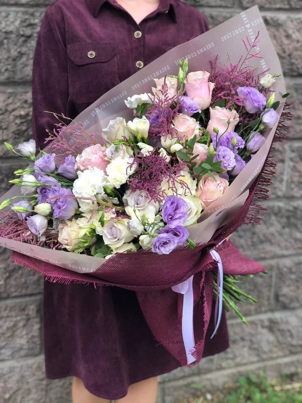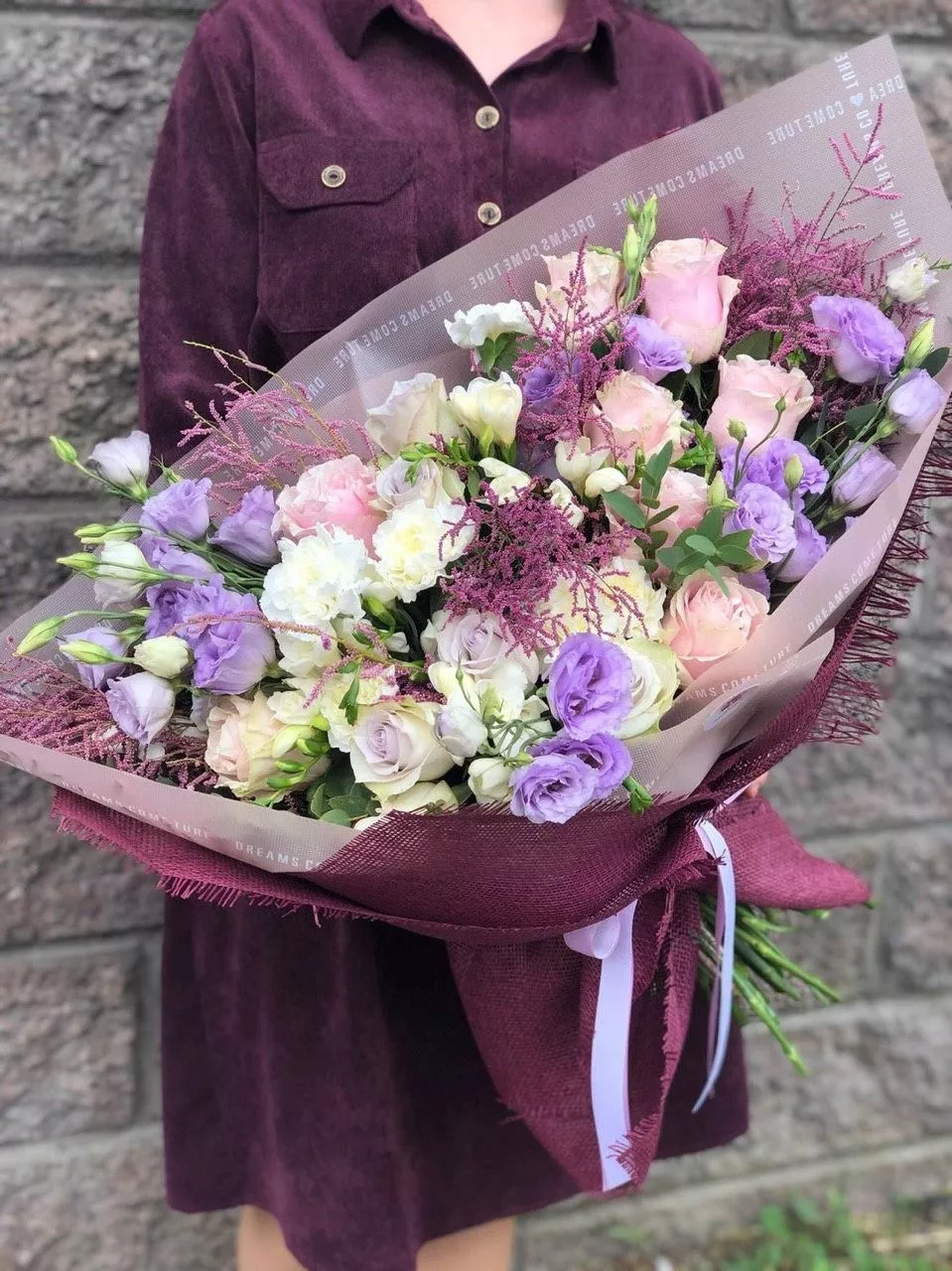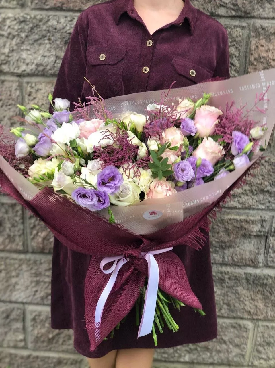 Букет "Цветочная Ария" из роз, фрезии, гвоздик, Лизиантуса и Астильбы