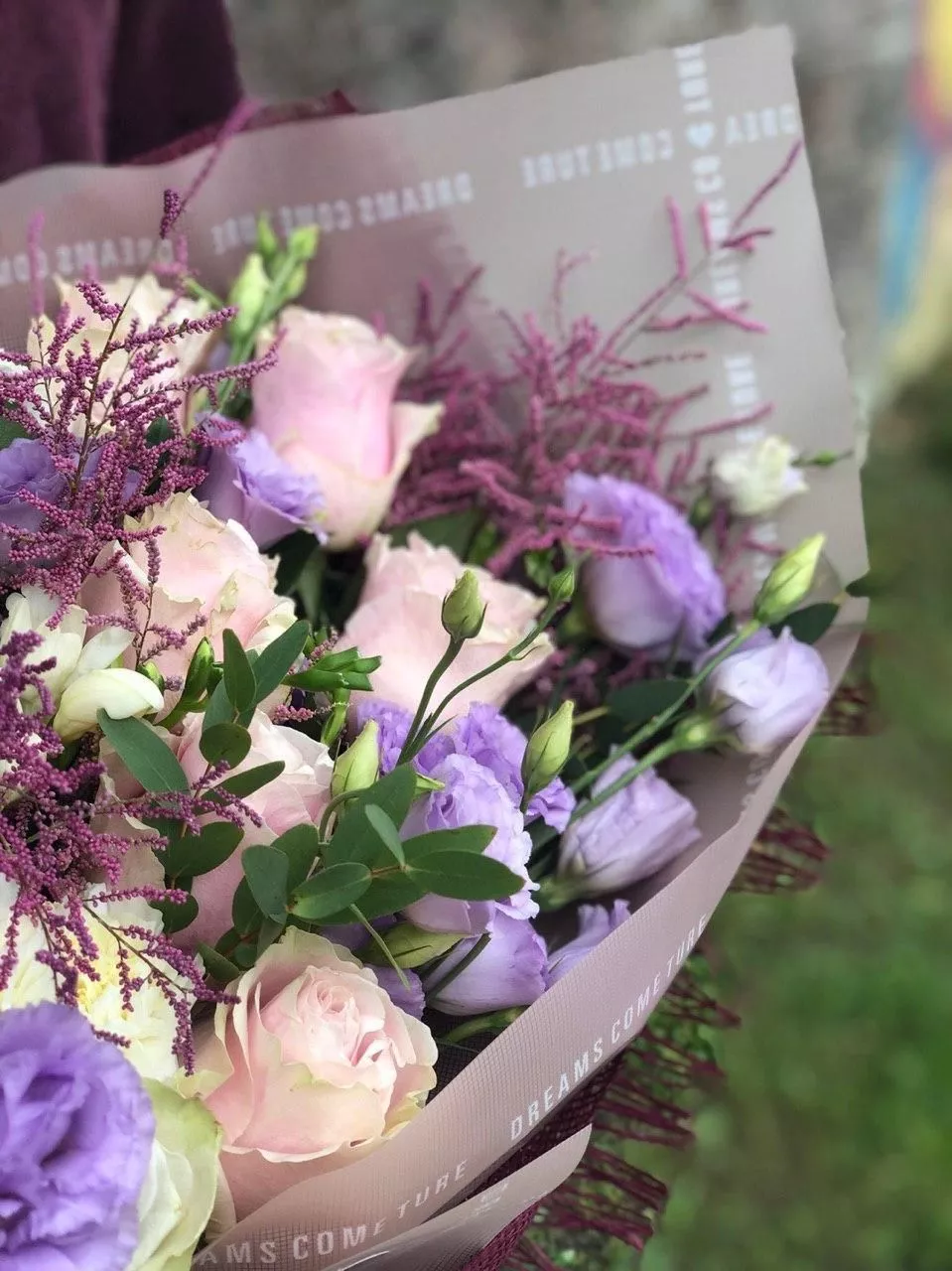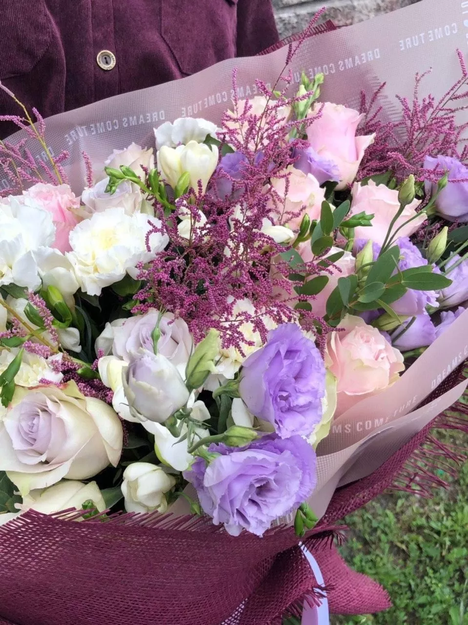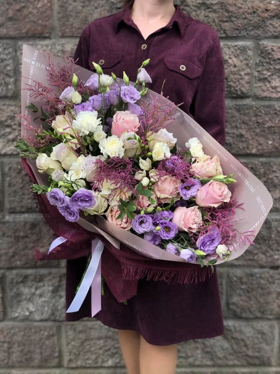 Букет "Цветочная Ария" из роз, фрезии, гвоздик, Лизиантуса и Астильбы