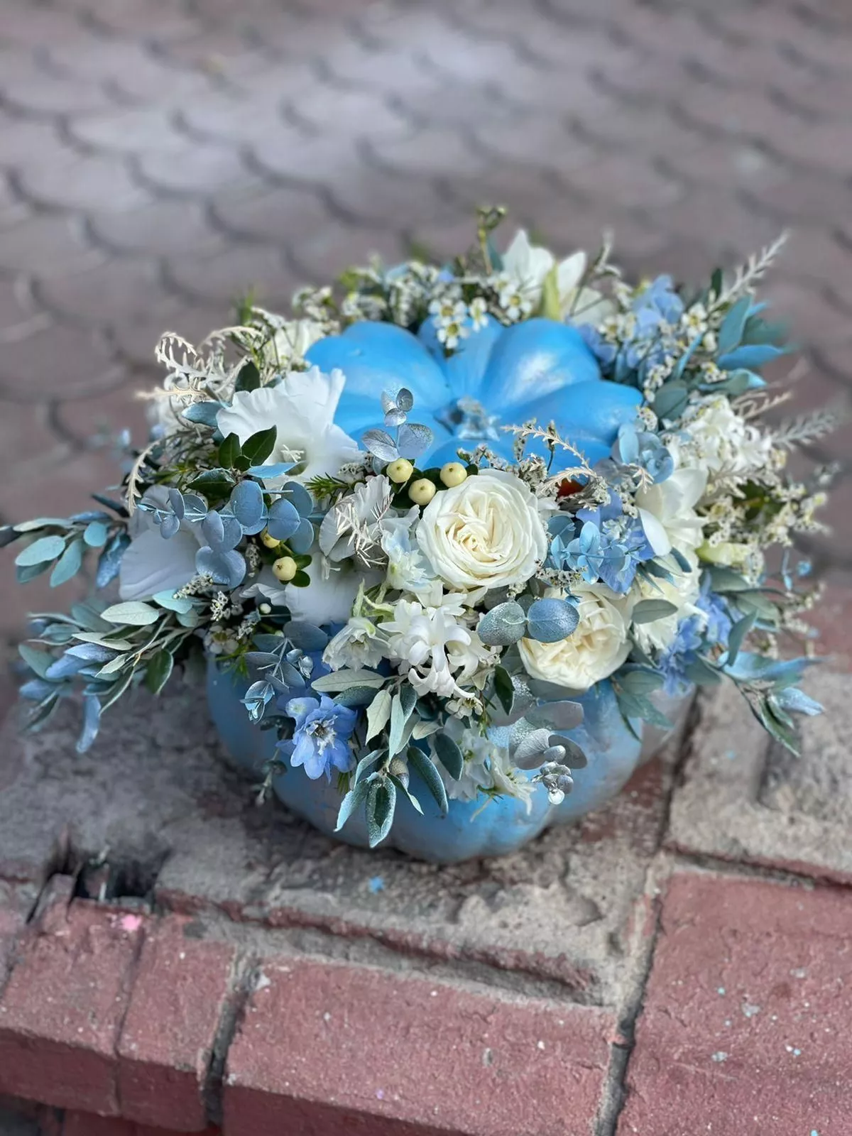 Букет в тыкве "Мраморная" из гиацинтов, гладиолусов, роз, тюльпанов и сухоцветов