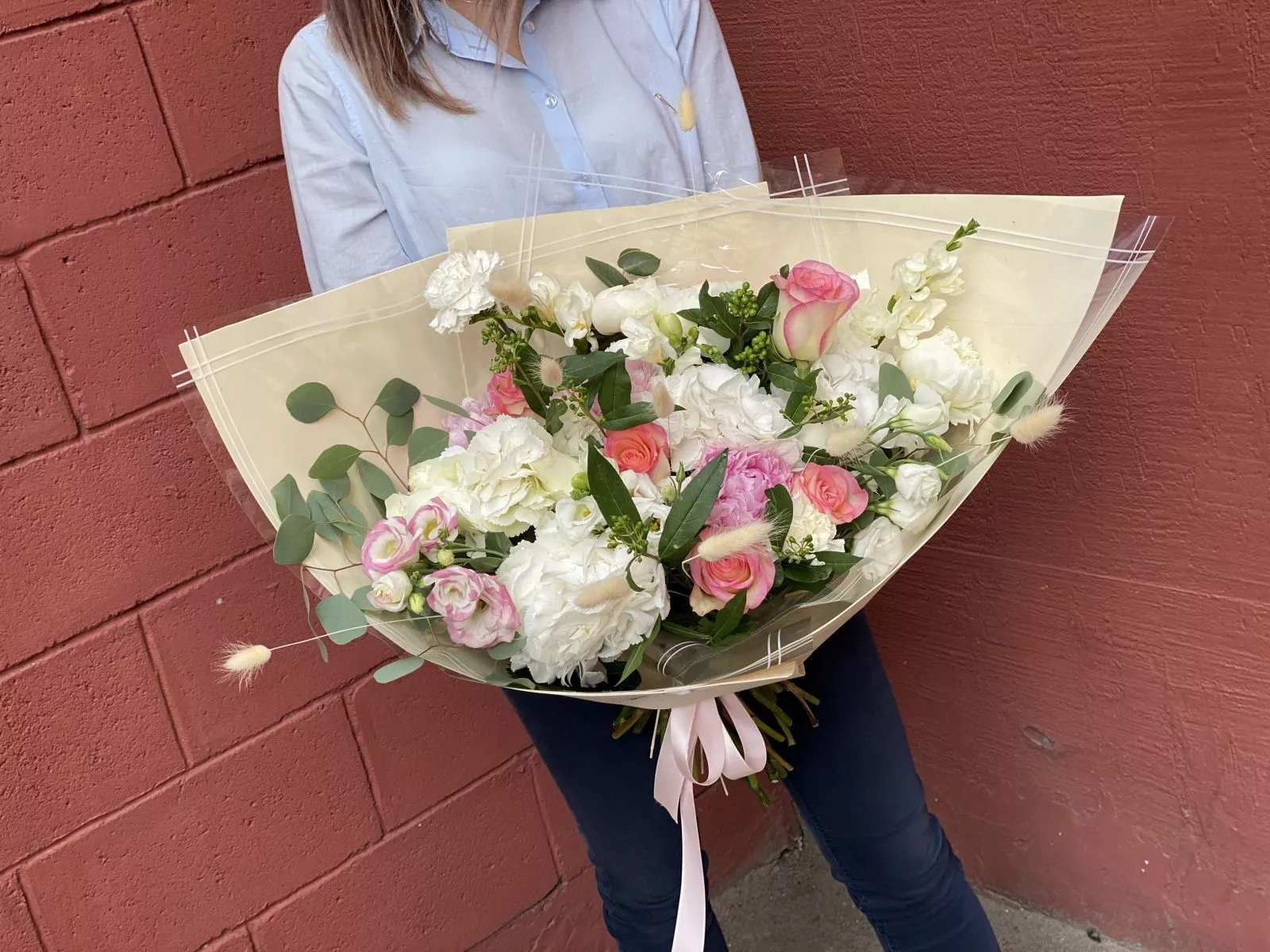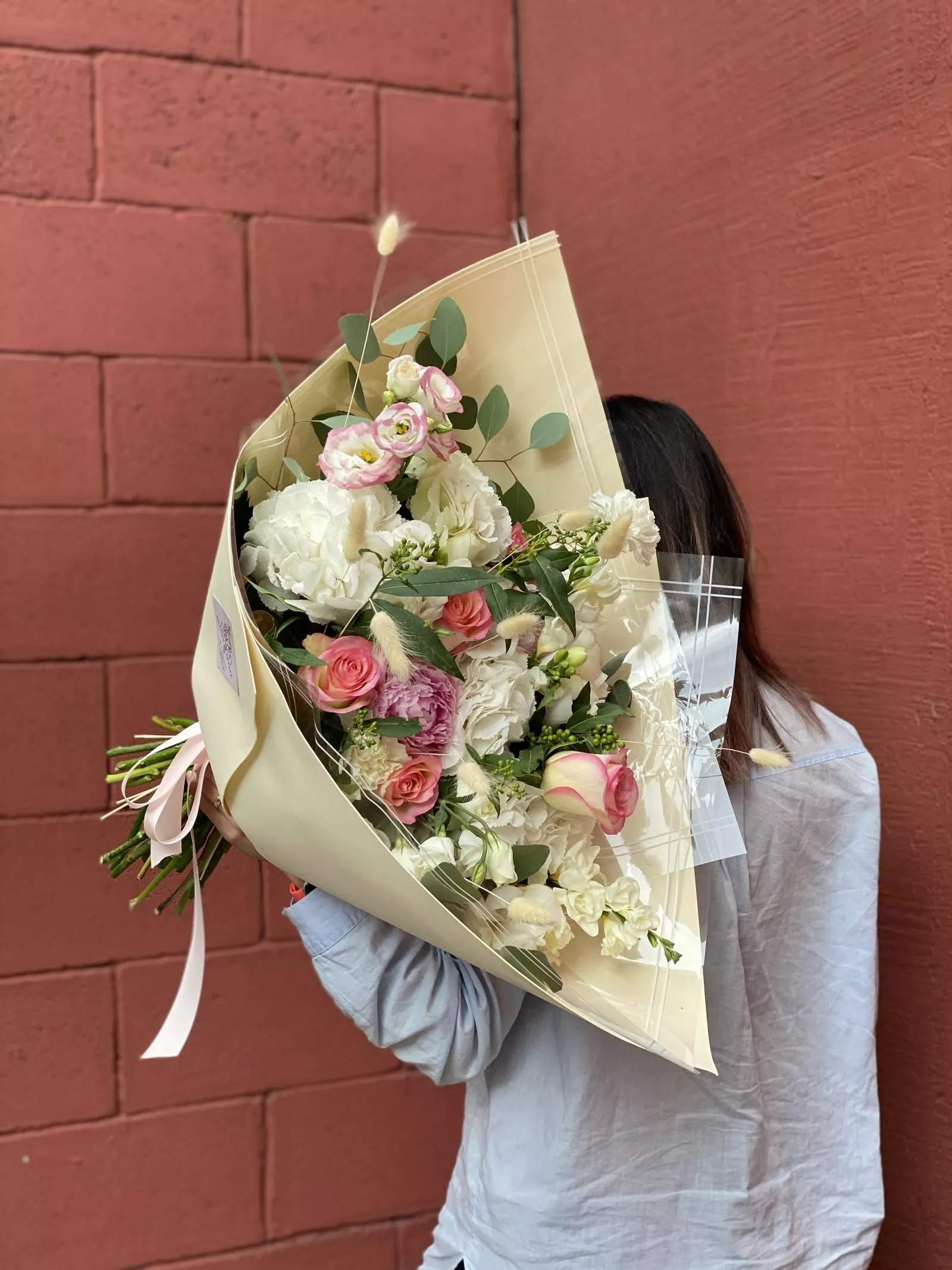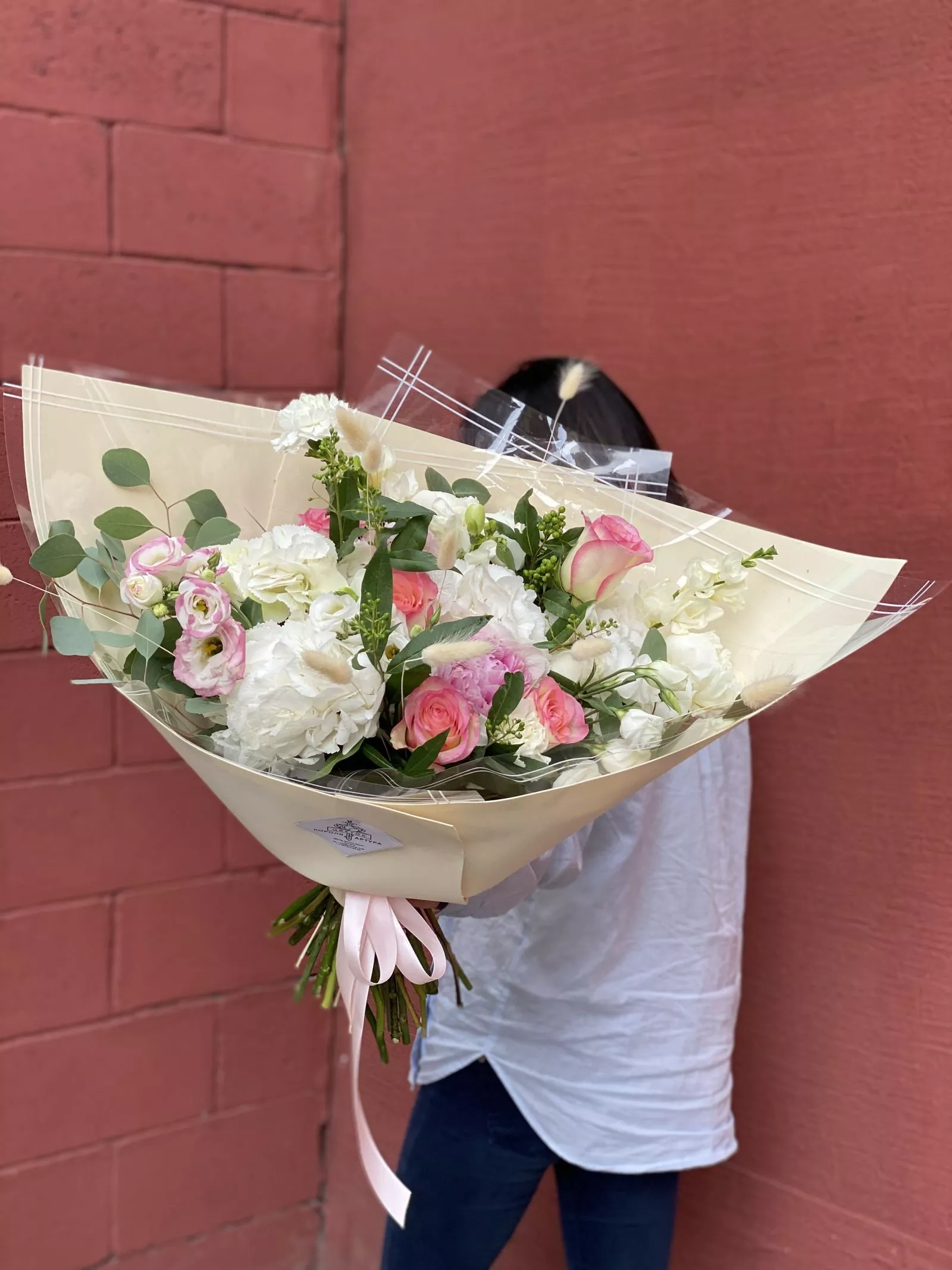 Гортензия (Колумбия) - 2; Роза голландская 60 см - 10; Лизиантус (Израиль) - 4; Эвкалипт (Голландия) - 3; Пион (Голландия) - 3; Гвоздика кустовая (Голландия) - 2; Фрезия (Голландия) - 2; Пшеница (Голландия) - 8; Зелень местная (средний букет) - 1; Калька в ассортименте - 2; Фоамиран толстый - 2; Открытка - 1;
