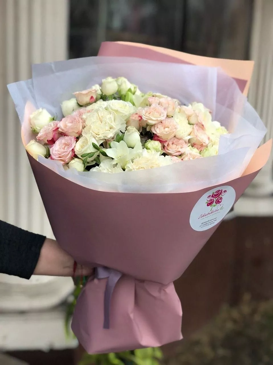 Спрей роза (Кения) - 9; Гвоздика (Голландия) - 5; Фрезия (Голландия) - 5; Калька в ассортименте - 4; Открытка - 1; Шпажка для открытки - 1;