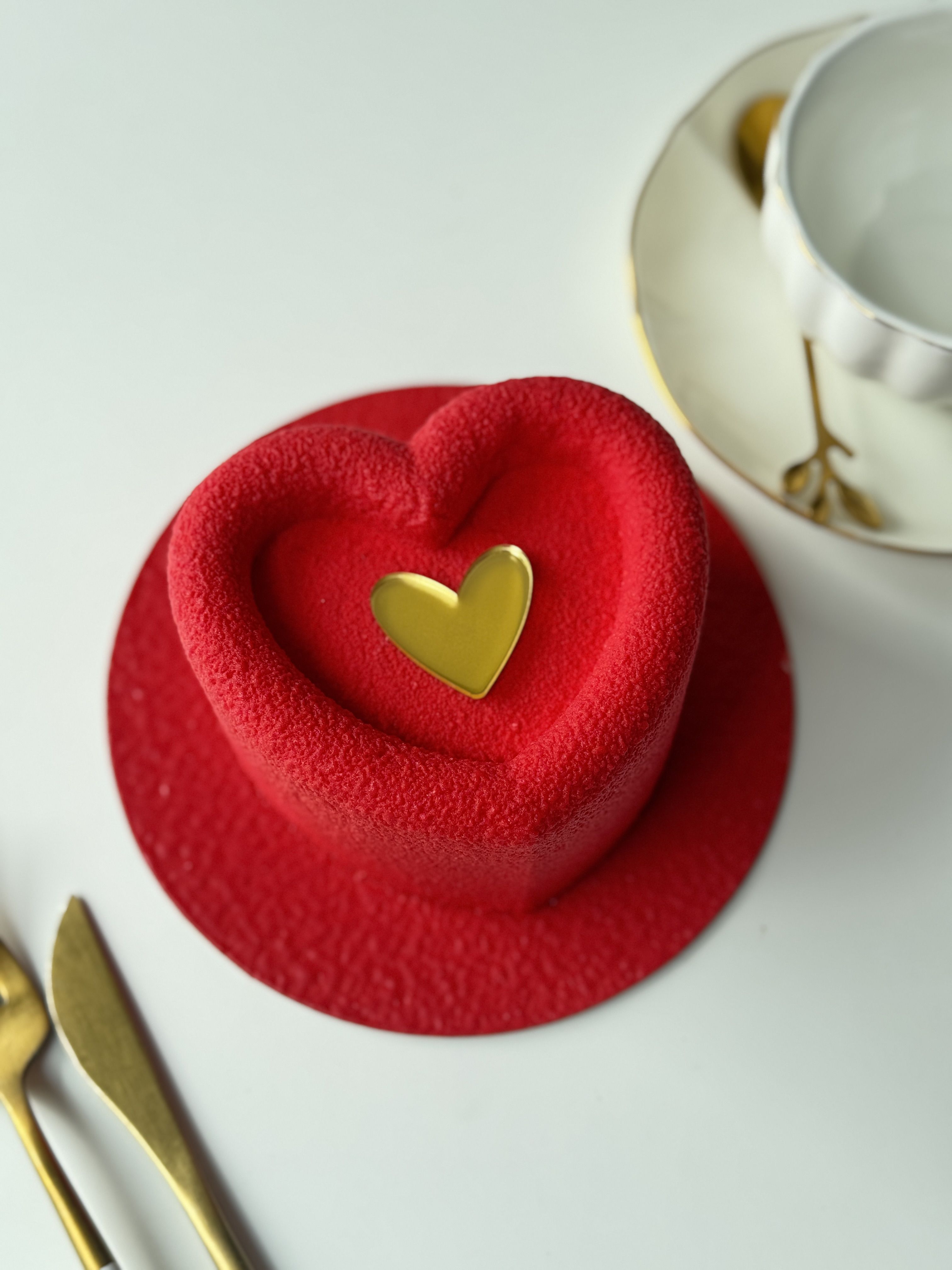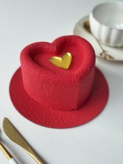 Эффектный муссовый торт в форме сердца с бархатным красным велюром и шоколадным акцентом в виде золотого сердца. Идеальный десерт для признаний и особых моментов.