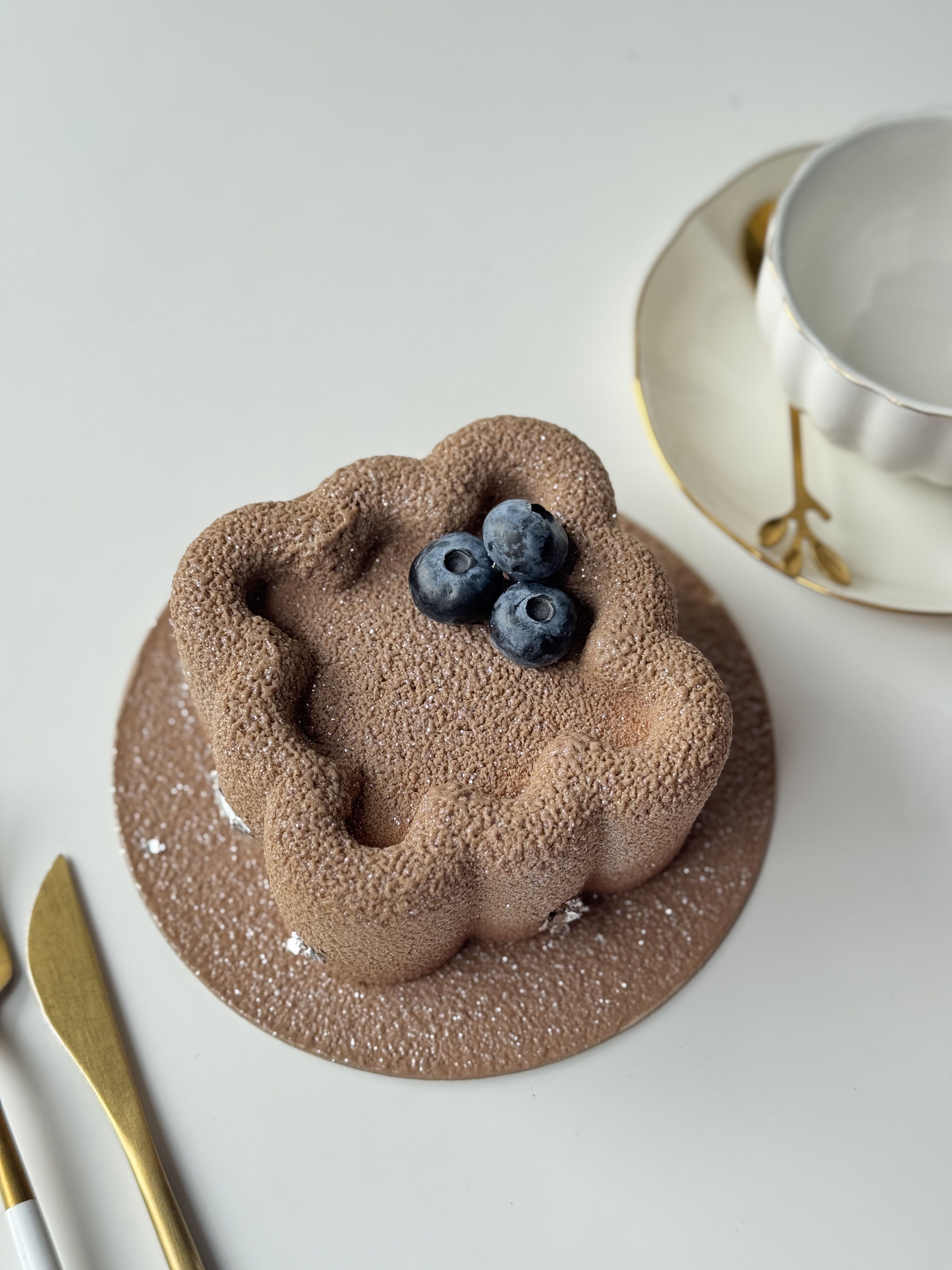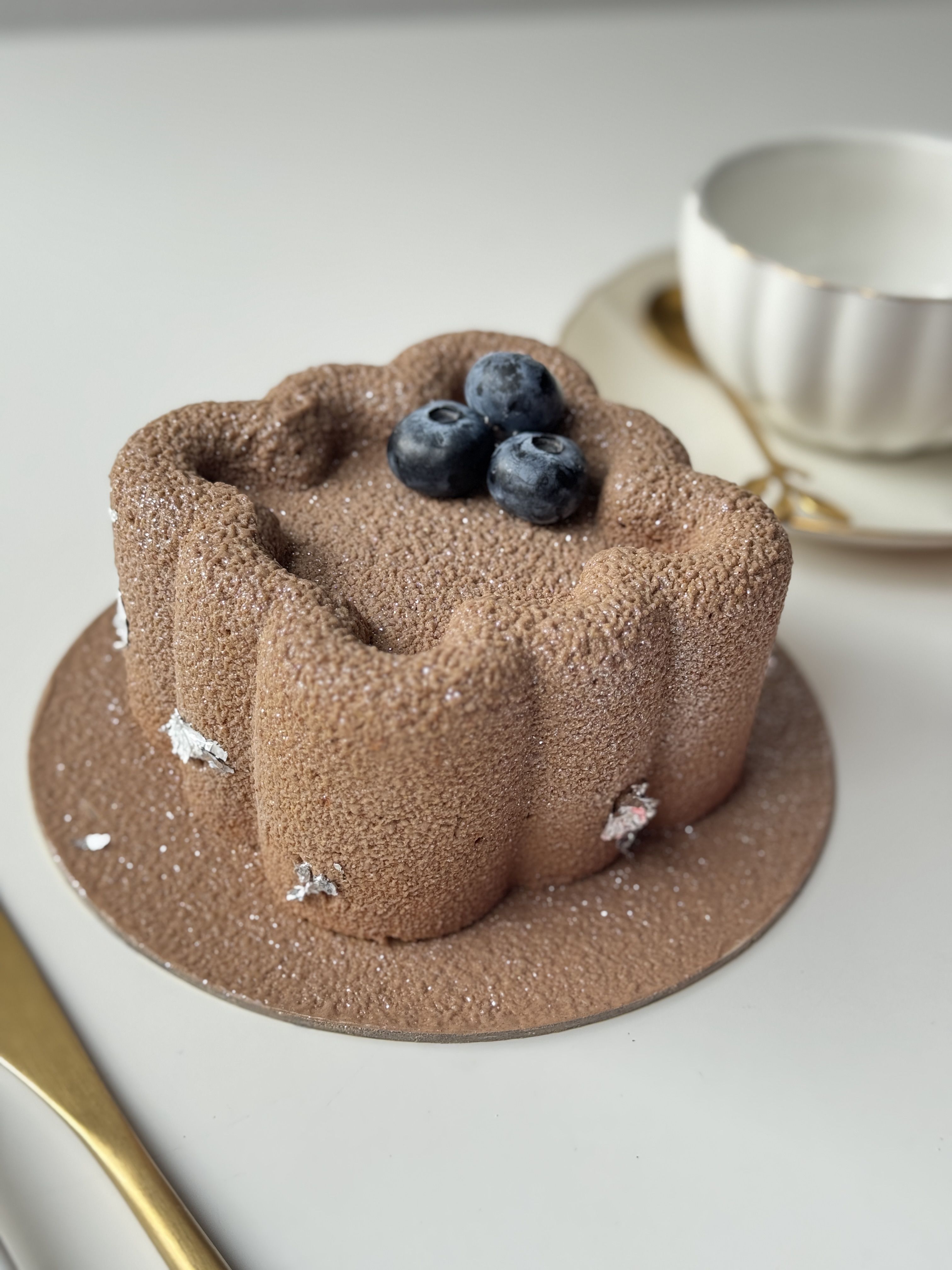 Шоколадный муссовый торт с бархатным велюровым покрытием, украшенный свежей голубикой и нежными штрихами съедобного серебра. Лёгкий, тающий и изысканный — для ценителей гармонии вкуса и стиля.
