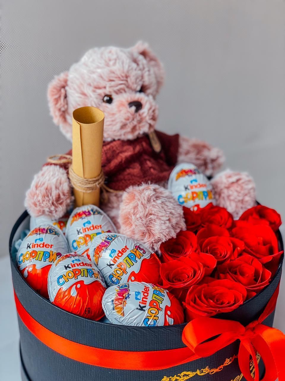 - 1; Открытка - 1; Kinder Сюрприз Яйцо - 7; 9 голландских роз в коробке - 1;