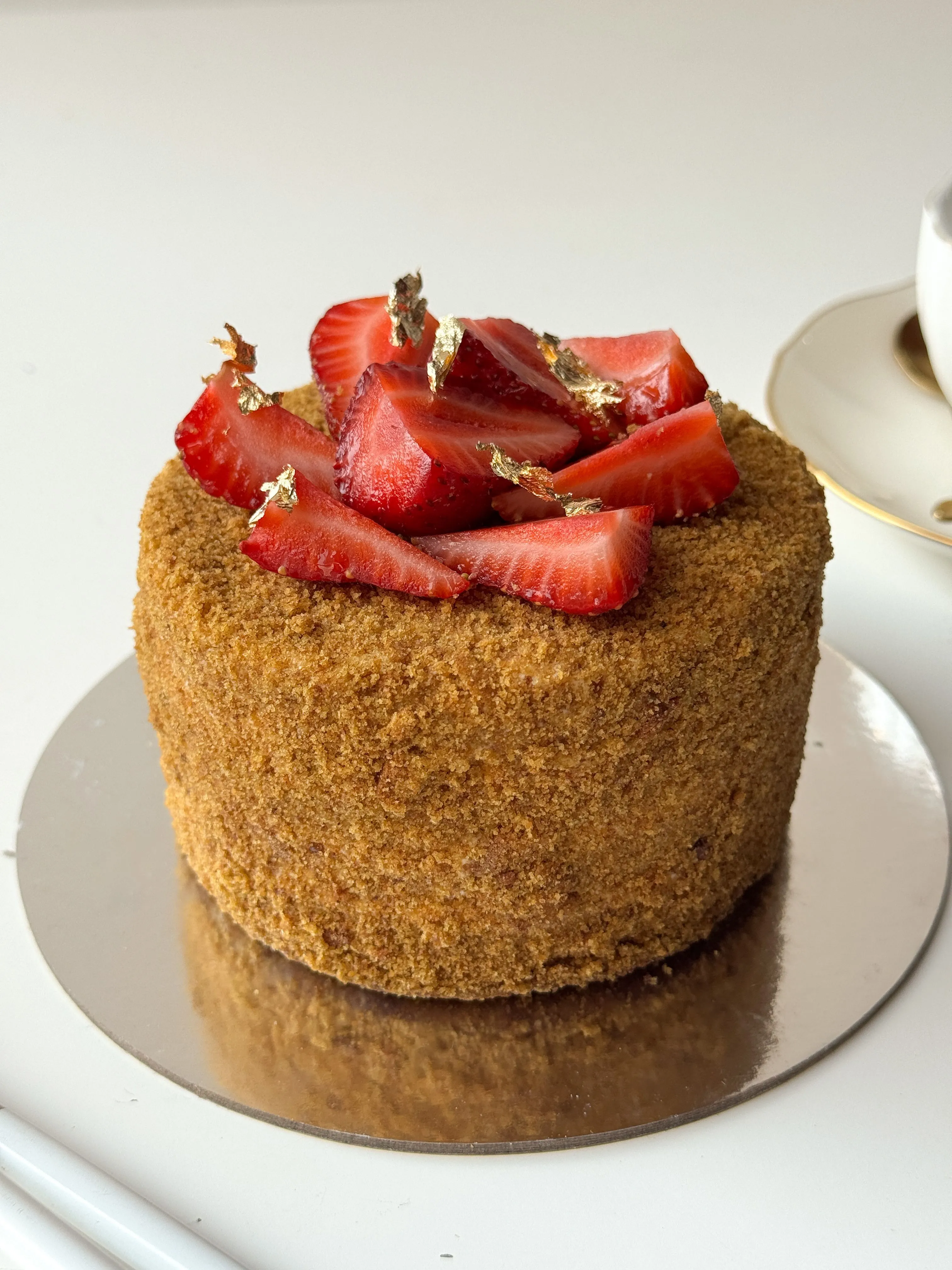 ПП-торт с мягким шоколадным бисквитом без сахара, воздушным кремом на натуральной основе и свежей клубникой, украшенной золотыми лепестками. Лёгкий, полезный и при этом по-настоящему десертный вкус.