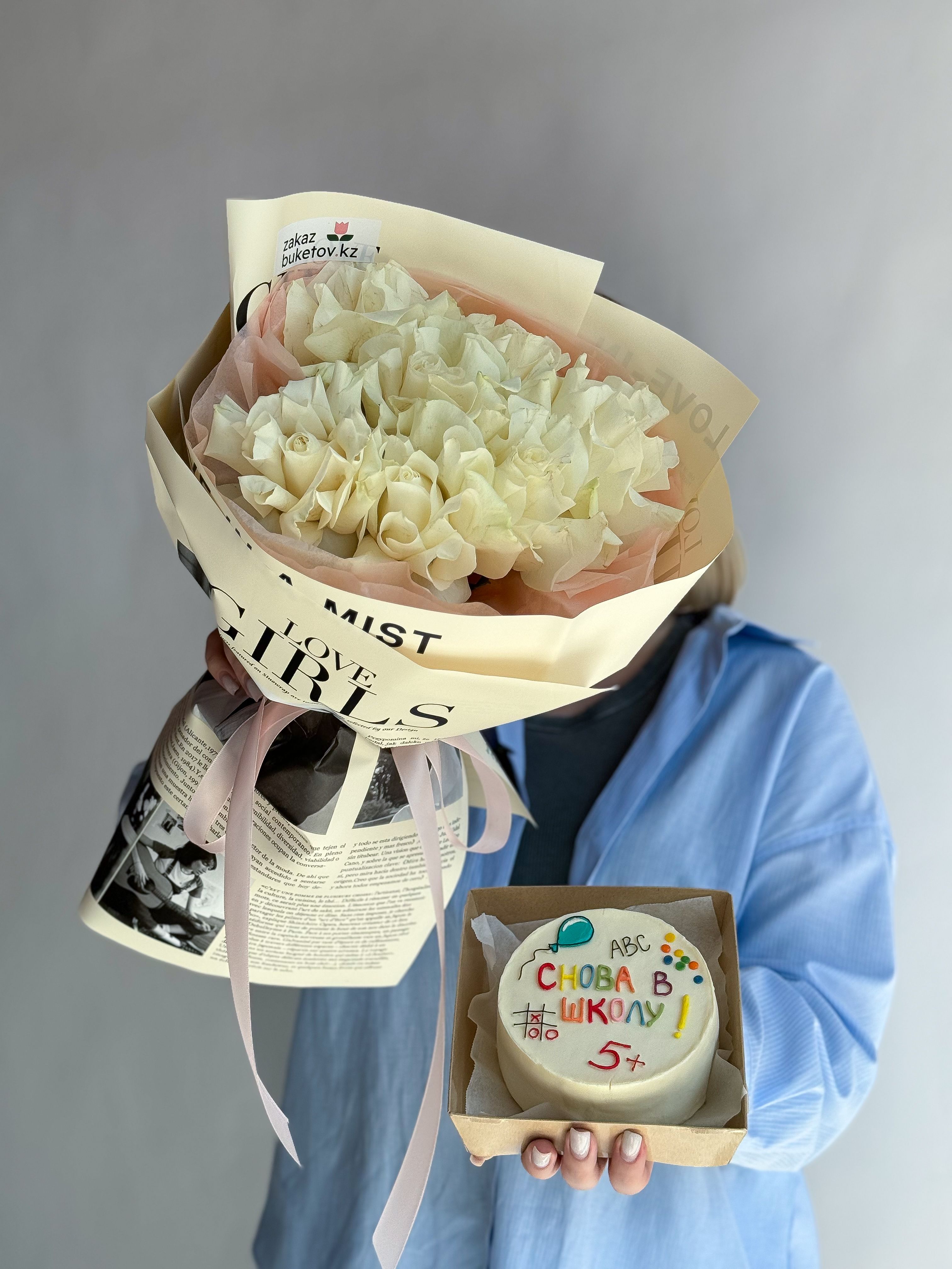Бенто-торт S - 1; Открытка - 1; Калька в ассортименте - 4; Роза голландская 60 см - 7;