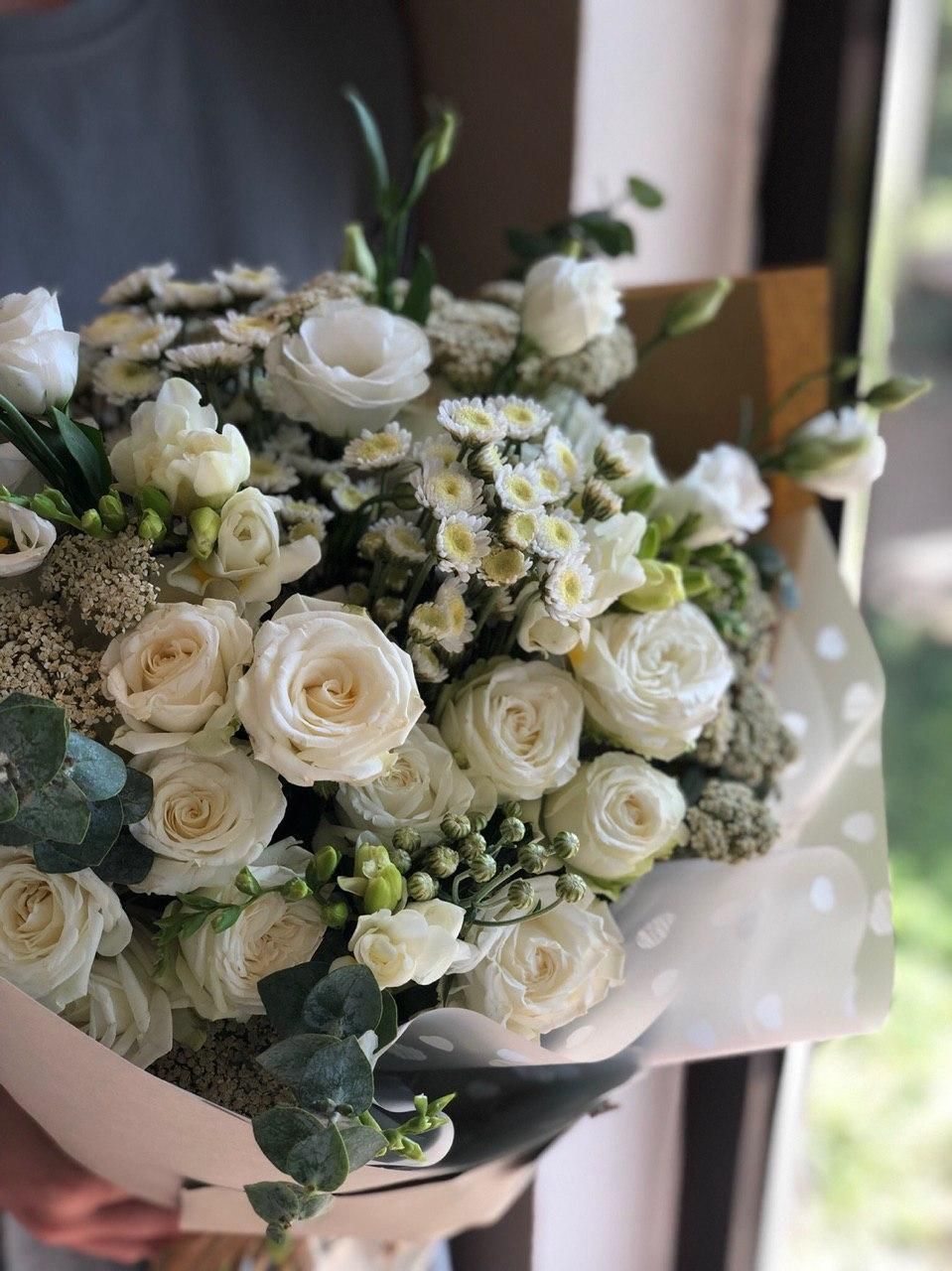 Спрей роза (Кения) - 5; Лизиантус (Израиль) - 2; Хризантема кустовая (Голландия) - 2; Фрезия (Голландия) - 3; Зелень местная (средний букет) - 1; Эвкалипт (Голландия) - 3; Калька в ассортименте - 4;